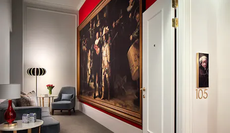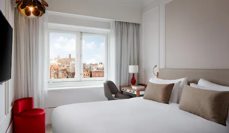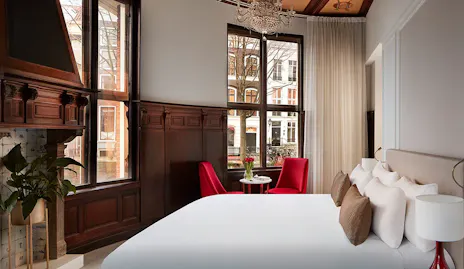 Onze 81 kamers en suites weerspiegelen de historische elegantie van Amsterdam en combineren klassieke stijl met modern comfort. Rijke tinten scharlakenrood, goud en crème creëren een verfijnde sfeer, terwijl moderne voorzieningen zorgen voor een ontspannen en comfortabel verblijf.